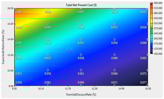 where is the nominal interest rate (%) and f is the yearly inflation rate (%). For this research, a 13.5% nominal interest rate and a 12% annual inflation rate were taken [56]. Within these parameters and utilizing Equation (3), a 1.34% real interest rate was obtained. This was considered as one of the sensitivity variables later.