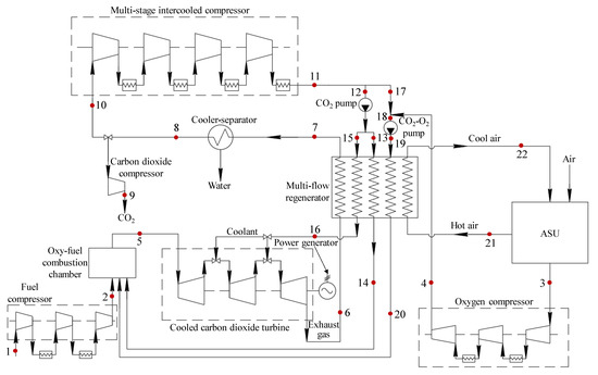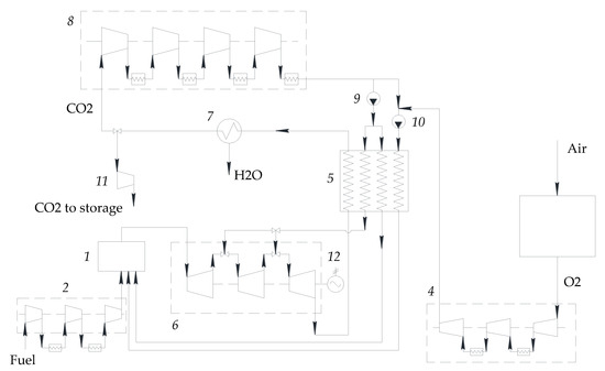 The main flow enters the multi-stage intercooled compressor. The compressed flow is split in two and directed towards the entrances of CO2 and CO2–O2 pumps. The inlet flow of pump CO2–O2 is pre-mixed with compressed oxygen. The high-pressure pumps’ exit flows enter the multi-flow regenerator and after heating, are directed toward to the combustor. The cycle is thus closed.