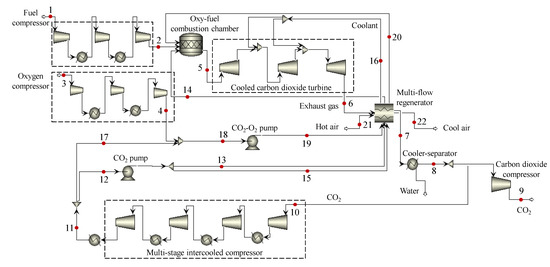 Thermodynamic studies of oxy-fuel combustion power cycles were carried out using the AspenONE code. The simulation flowchart is shown in Figure 3, along with the flow parameters in Table 3. The scheme included an oxy-fuel combustion chamber; a cooled carbon dioxide turbine; a multi-flow regenerator; a cooler–separator; a multi-stage, intercooled compressor; oxygen, fuel and carbon dioxide compressors; and CO2 and CO2–O2 pumps. The thermo-physical performance of the operating fluid was calculated via the Peng–Robinson thermodynamic state equation.