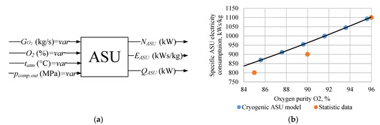The ASU model was verified by the relationship of its power consumption and oxygen purity (Figure 4b). The calculated results were compared with the existing facility’s statistical data [33]; the level of results convergence was acceptable.