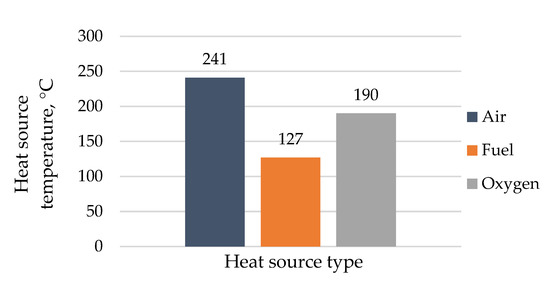 The compressed air flow had a maximum temperature of 241 °C (Figure 5) and a maximum thermal power of 29.4 MW. The oxygen flow potential was also high, with a temperature of 190 °C and a thermal power of 8.7 MW. Contrary to this, the compressed fuel supplied to the intermediate coolers at 127 °C and 3.6 MW had relatively low thermal power. As such, the further analyses considered only two sources with maximal potential: the compressed air and the oxygen. The carbon monoxide flow that was compressed in the multi-stage, intercooled compressor was not considered as a low-potential heat source because of its very low temperature (about 55 °C).