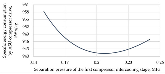 Besides this, the optimal separation pressure that allowed minimal losses in oxygen production in one-stage intercooling was 0.26–0.28 MPa (Figure 8), and the ASU compressor drive’s specific energy consumption dropped from 1093 to 976 kW s/kg.