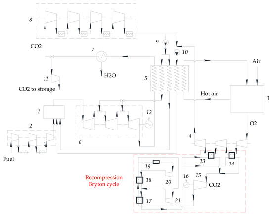 Figure 10 shows the Allam cycle utilizing the heat of the oxidizer in the Brayton cycle with recompression. The carbon dioxide heat carrier is employed because it balances the losses in the working fluid without any additional losses caused by the removal of some carbon dioxide flow from the main cycle.