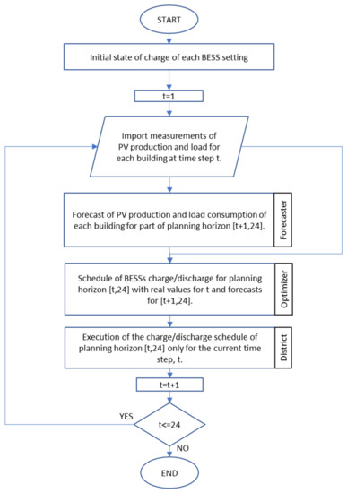 The proposed MPC-based method consists of three main parts, i.e., (a) the forecaster, (b) the optimizer, and (c) the district. A schematic representation of the controller, which is developed in Python, is presented in Figure 2. The three main components interact periodically with each other, considering that the planning horizon is the time interval from the current time step, t, until the end of the day. The loop described in Figure 2 is repeated for 24 times in total, once per hour. The specific tasks of each component of the control system are briefly described below: