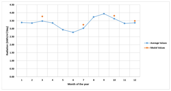 The days that have been selected for the simulation of the implementation of the MPC-based control on a hypothetical district located in Greece are the 10th of March, the 26th of July, the 7th of October and the 16th of December, assuming more or less a day in each season of the year. The selection of the simulated day of each month is based on the profile of radiation. More specifically (considering vertical placement, facing the South) the measured radiation is close to the daily average values of radiation on vertical façade facing the South for the period 2005–2016, calculated by [53], presented in Figure 4. It is noted that the vertical position of the BIPV panels causes higher absorption of radiation during winter than during summer.
