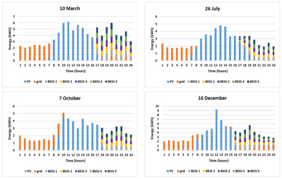 Overall the profile of the energy mix of each simulated day of scenario A, presented in Figure 8, follows the trend of the respective energy mix of the reference case (presented in Figure 6). This means that in both cases, the main power supply during the early hours of the simulated days is the external grid, due to the lack of PV production and adequate battery energy. Furthermore, in both cases the demand in noon is mostly covered by PV production. Finally, as in the reference case, scenario A, the five BESS (which are charged when the PV production exceeds the demand, as presented in Figure 7) are optimally discharged in the evening, when the PV production is insufficient, as presented in Figure 8.