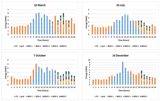 The maximum total PV production occurs in the simulated day of March, i.e., 82.18 kWh, and covers directly higher demand than the rest of the simulated days, i.e., 44.75 kWh, due to the fact that the curve of the PV production matches the load peak in the morning-noon hours of March. Also, in the simulated day of March, the highest amount of energy provided by the BESS occurs, i.e., 33.69 kWh, followed by the respective value for the simulated day of December, i.e., 29.81 kWh. This is attributed to the high demand observed in the evening hours for the simulated days of March and December, as presented in Figure 6, after the PV production has ceased. In general, the load of the simulated days of March, i.e., 96.46 kWh, and December, i.e., 94.97 kWh, appears to be higher than the load of the rest of the simulated days, mainly because of the thermal needs that are covered through electrical means, such as heaters, heat pumps etc. In fact, the load of these days is high enough to also require the contribution of the grid in the evening hours, as presented in Figure 6, calculated as equal to 1.89 kWh for the simulated day of March and 5.51 kWh for the simulated day of December.
