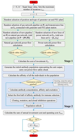 The solving process for the model is shown in Figure 1. The model solving method in this paper can be divided into two stages. The planning optimization stage is the first stage. In this stage, the network structure satisfying all constraints of the model is generated randomly. The operating optimization stage is the second stage. In this stage, based on the network formed in the planning optimization stage, the optimal outputs for all units are solved by the immune algorithm. In the flowchart shown in Figure 1, stage 1 represents the planning optimization stage, and stage 2 represents the operating optimization stage. In each iteration, the new total cost is calculated by summation of the optimization results from stage 1 and stage 2. Then, by comparing the new cost with the previous minimum cost, the optimal cost and the relevant data are retained. At the end of each iteration, a judgment is made on whether it meets the number of maximum iterations; then, the optimal result is output. The detailed calculation steps for the two stages are described below.