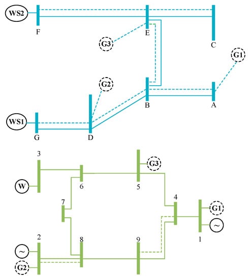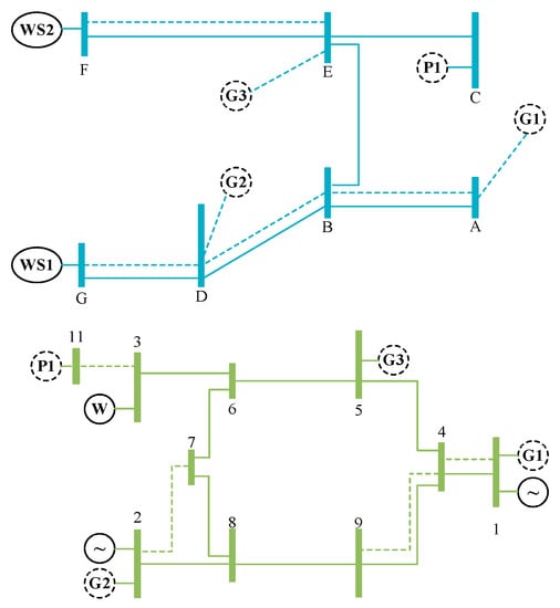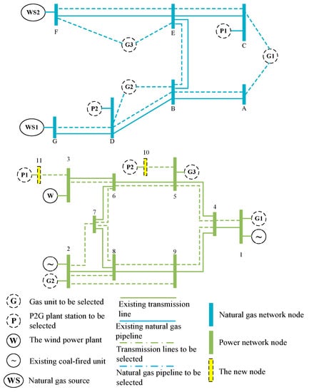 In this paper, an electricity-natural gas coupling system composed of a nine-node natural gas network and a nine-node MATPOWER power system was taken as an example, as shown in Figure 2. MATPOWER is a package of MATLAB M-files for solving power flow and optimal power flow problems.