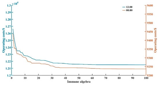 The operation cost for each hour in a typical load day was calculated by the proposed immune evolution method. The convergence trends are very close. Therefore, in order to give a clear picture, only the immune evolution curves at 12:00 and 00:00 were selected and drawn in Figure 5 to validate the convergence characteristics of the algorithm. It can be seen that the immune algorithm had good convergence characteristics in terms of unit output optimization. The correctness of the algorithm parameters was also validated.