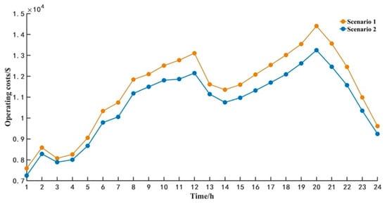 Compared with scenario 1, scenario 2 showed lower annual operating costs. This was because the construction of the P2G plant station absorbed the curtailed wind energy of the wind farm and reduced the output of the natural gas wells. At the same time, the bidirectional coupled system composed of the P2G and gas unit had a large space for output regulation. Therefore, the operation cost can be reduced by optimizing the output of the unit. A day representing the average daily load for future years is selected as the typical day []. The hourly operating costs for typical days in the system under the two scenarios were compared as shown in Figure 6. Detailed hourly unit output distribution values are listed in Appendix A Table A7 and Table A8.