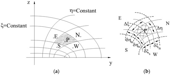 Continuous surface subdivided into nodal points. (a) Identification of the control volume and (b) geometric parameters of the control volume in the oblate spheroidal coordinates system.