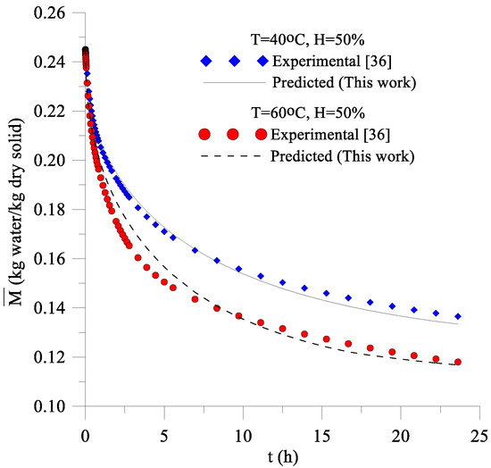 The Luikov model [20] and Fortes and Okos [19] model are examples of models based on the thermodynamics of irreversible processes. Luikov’s theory takes into account the mechanisms of diffusion, effusion, and convection of water inside the porous medium. Therefore, the equations that define the Luikov model take into account that the molecular transport of water vapor, air, and liquid happen simultaneously [21]. On the other hand, Fortes [22] and Fortes and Okos [19,23] proposed that the driving force for isothermal transfer, both liquid and vapor, is the gradient of equilibrium moisture content, due to the local equilibrium hypothesis, which, in turn, is a function of temperature, relative humidity, and equilibrium moisture content. Detail about the non-equilibrium thermodynamic can be found in the references cited in the text.