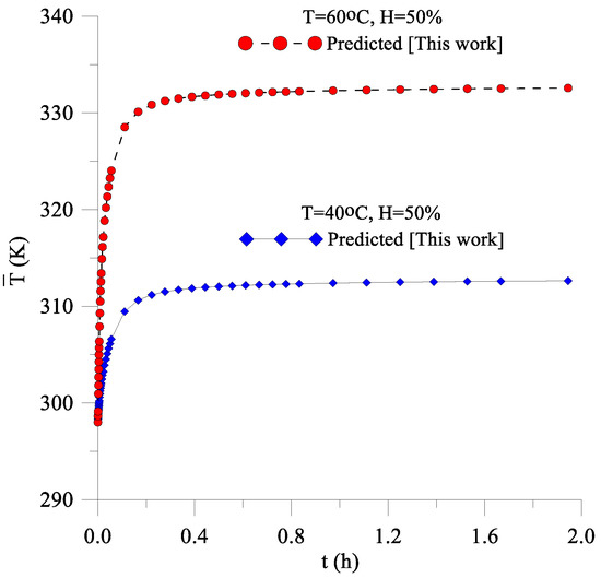 Figure 5 shows the average heating of lentil grain over the drying time. It is possible to observe that the average temperature of lentil grain rises rapidly in the first 400 s of the drying process and reaches the equilibrium temperature in a time interval of approximately 1 h, with a smooth growth (moderate heating rate) for long times, due to the convective boundary condition used in this model. Furthermore, the higher the air temperature, the higher the heating rate. A comparison of Figure 5 and Figure 6 shows that the moisture removal rate is much lower than the heating rate of lentil grain. However, for low drying temperature, it is expected that the grain does not present thermal and hydric damage, maintaining its post-drying quality.