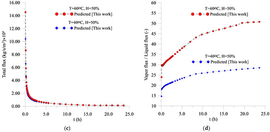 (a) Liquid flux, (b) vapor flux, (c) total flux, and (d) relationship between the vapor flux and the liquid flux, on the surface of the lentil grain for drying at 40 °C and a relative humidity of 50%.