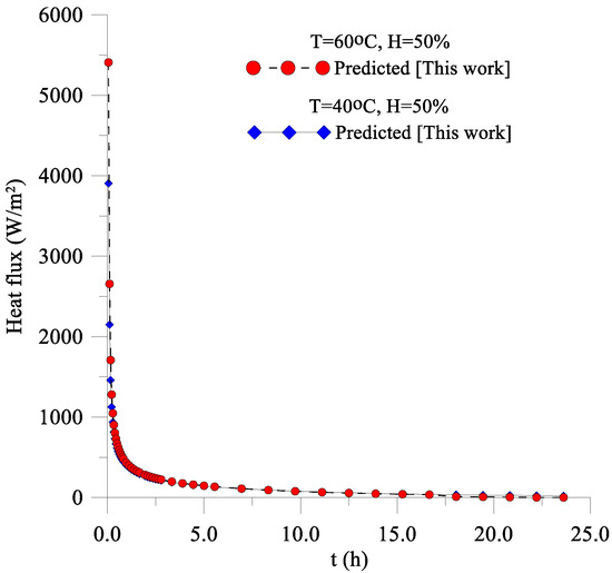 Figure 7 shows the heat flux on the surface of the lentil grain during the drying process. It is possible to observe that, during the drying time, the heat flux decreased significantly up to 2 h of drying; after this time, the heat flux decays more slowly, tending to remain constant until the end of the drying process (thermal equilibrium). This heat is used both to heat the grain and water in the liquid phase up to the saturation temperature (sensitive heat) and to evaporate, at saturation temperature, the moisture of the grain that reaches the surface (latent heat). For both the air temperature, heat flux presented almost the same transient behavior. However, at 200 s, heat flux reached the value 3996.14 W/m2 at T = 40 °C, and 5409.48 W/m2 at T = 60 °C.