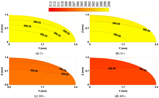 The temperature distribution inside the lentil grain is presented in Figure 9, at times 1000, 5000, 10,000, 20,000, 40,000 and 85,000 s. The constant temperature lines (isotherms) showed that the heating is faster on the surface of the solid, and this heating process occurs from the surface to the center of the body, unlike that of the moisture content. However, unlike what has been verified for moisture content, the temperature distribution inside the lentil grain is practically uniform at any drying time, a typical condition of low convective effects.