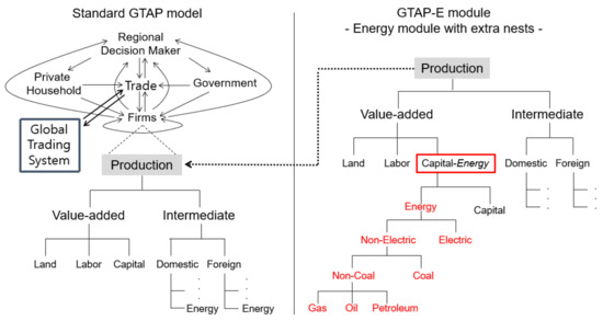 - Truong, T.; Kemfert, C.; Burniaux, J.; GTAP-E: An Energy-Environmental Version of the GTAP Model with Emission Trading. DIW Discussion Papers 668. 2007. Available online: https://www.gtap.agecon.purdue.edu/resources/download/3552.pdf (accessed on 17 December 2020).