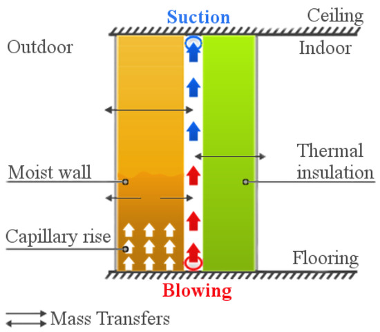 Few research works currently focus on these subjects, due to the complexity of the physical problems involved (coupled heat and moisture transfers, aeraulics, etc.). Nevertheless, in several European countries, investigations have been carried-out to develop two different solutions: the University of Stockholm is studying the implementation of a ventilated and heated double skin [16,17,18,19], and the Laboratory of Building Physics (LFC) of the Porto University of Engineering proposes ventilating only the base of the wet wall [20,21,22,23,24,25]. These technical solutions involve strengths and weaknesses linked to their mode of operation and regulation, their implementation, their effectiveness or their long-term sustainability: deep changes in the building envelope to create a unique ventilation network for the floors and walls, installation of a 15 W/m heating cable in permanent operation and intervention on both sides of the wet walls, without any guaranteed long-term results.