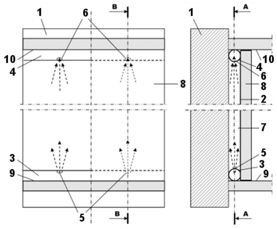 The removal of moisture between the wall and the thermal insulation is carried out by periodically renewing all humidity-laden air in the buffer space with fresh air taken from outside. This periodic use allows one to avoid continuous operations that would lead to important ventilation costs. Figure 2 schematically depicts the elements of the system installed on a damp wall (1) between the floor (9) and the ceiling (10) of a room to be rehabilitated. The sanitation (buffer) space (7) is located between the surface of the wall and a screen (2) with an appropriately selected water vapor permeability. This screen is covered by a thermal insulation layer (8). In this space (7), an inflow pipe (3) with small blowing apertures (5) is located on the floor, and an outflow pipe (4) with small suction apertures (6) is located right under the ceiling.