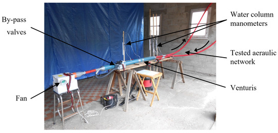 An aeraulic measuring bench was realized to validate the chosen methodology and the calculation of operating point and volumetric air flow rate (Figure 3). This experimental device consists of a fan with adjustable blowing pressure, from 0 to 5 kPa (HELIOS SlimVent SVV80). The flow/pressure torque is controlled by 4 shunt by-pass exhaust valves at the entrance which allow the regulation of the volumetric air flow rate from 0 to 72 m3/h. The pressures are measured using 4 water column manometers (500 mm high), and the air flows are measured by 2 genuine custom venturis.