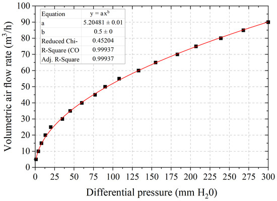 The characteristic of custom venturis is assessed from blowing tests at different volumetric air flow rates, from 5 to 90 m3/h as presented in Figure 4. The volumetric air flow rate vs. differential pressure of venturis is fitted according to the following function, from the principle of energy conservation of Bernoulli’s theorem: