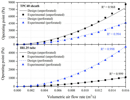 The experimental results are compared with the corresponding results obtained from the analytical approach in Figure 5, where the evolution of the network operating point according to the imposed flow is presented for the four tested configurations. The correlation coefficient () is close to 1 in all four cases, which tends to demonstrate the robustness of the aeraulic approach formulated herein. Nevertheless, results show a small difference between experimental and analytical data in the case of non-perforated TPC40 tubes, for relatively high flow rates, greater than 50 m3/h. Although the error is non negligible (in the order of 10% maximum), the ventilation system used in the case of the sanitation of the walls never reaches these high rates.