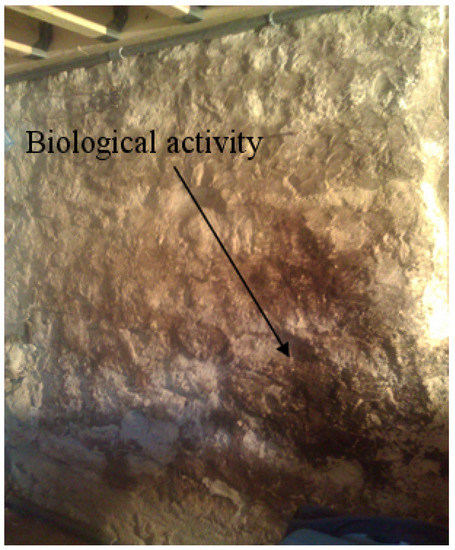 Figure 7 shows traces of moisture and biological activity visible on the partly-buried stone wall of the cellar. Before renovation, the water beaded directly onto the surface of the wall, forming a thin film of water on the surface; the relative humidity on the inside surface of the wall can therefore be considered equal to 100%. Signs of biological activity are also visible on the surface of the wall, particularly through mold that develops in this environment (mild temperature and liquid water).