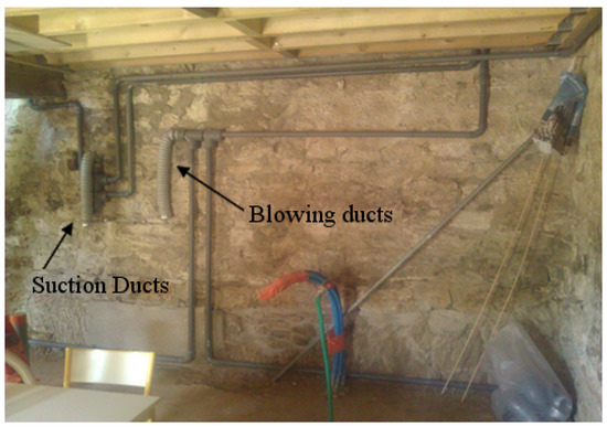 After laboratory validation, the experimental device was implemented in a detached old house located in Puiseux-en-Retz in the Picardie region of Northern France. The dwelling equipped with the aeraulic system is a two-floor stone house and comprises two buildings arranged in an L-shape. Semi-buried walls facing south (on the left in Figure 6) are the most affected by water infiltration and risk of frost. The system is implemented on both floors, but only the cellar, on the bottom floor, was subject to hygrothermal monitoring (Figure 6).