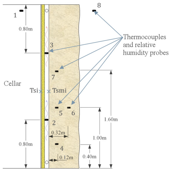 The buried wall of the cellar was instrumented with different calibrated temperature (T-type thermocouples) and relative humidity (VAISALA HMP60) probes. The latter were arranged at various heights and depths in the wet wall and in the ventilated air space, as presented in Figure 9. Additional probes were installed inside the cellar and outside the house (sensors 1 and 8). Temperature sensors were located on the surface of the stone wall and on the interior finishing plasterboard (respectively and ). The sensors were connected to a Graphtec GL 800 mini data logger. Data recording followed a frequency of 1.67 × 10−3 Hz. Data acquisition was carried out over a period of more than a year.