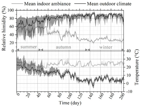 Evolution of the outdoor (black) and indoor (grey) relative humidity and temperature. Solid lines represent the daily mean measurements while shaded areas represent variations measured each day by sensors 1 and 8.