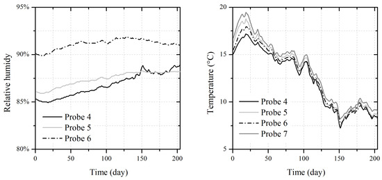 First, the temperatures and relative humidities were measured in the wet or damped wall using probes 4 to 7. Probes 4, 5 and 7 were located close to the inner surface, while probe 6 was about 32 cm deep. The initial observations highlighted the presence of liquid water on the inner surface of the wall due to liquid flow transfers within the wet wall, and condensation due to the temperature difference between the heated room and the wet wall. The ventilation system then makes it possible to suppress the presence of liquid water, as can be seen in Figure 11, where relative humidity levels are always well below 100%, regardless of the season. The relative humidity at the core of the wall was higher, above 92%, while the relative humidity at the surface was kept below 90% (probe 7 was damaged during the renovation phase; the data collected are unfortunately not usable). The measured temperatures inside the wall are relatively homogeneous (see Figure 11) and highly dependent on the outside temperature. Thus, the evolution of the relative humidity represents the hygroscopic flows in the wall: an equilibrium appears to have been reached, helping to maintain the mechanical performance and to suppress liquid water on the wall surface. Moisture content is higher during colder periods due to the impact of temperature on the water storage capacity of moist air.