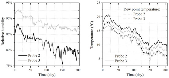 Evolution of relative humidity (left) and temperature (right) in the ventilated air space: Probe 2 was placed at the bottom of the air space while probe 3 was fixed at the top of the air space.