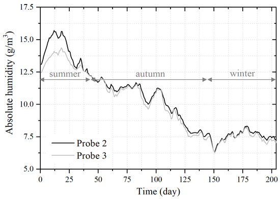 Figure 13 presents the evolution of the absolute humidity with respect to time for probes 2 and 3, respectively. The absolute humidity was higher in summer than in the fall and winter periods, leading to higher moisture transfers during summer. In the case of a semi-buried wall, moisture transfers were horizontal and vertical but capillary rises were stronger during summer, as shown by the significant difference between probes 2 and 3. During this season, a greater amount of water in the lower part of the ventilated air gap was observed, as outside temperatures were at their highest. The air blown from the roof has a high temperature (between 20 °C and 30 °C) and a daily relative humidity of more than 60%. The absolute amount of water present in the air was then significant, greater than that present on the wall surface. The overall system was balanced with water vapor transfers towards the wet wall. Nevertheless, during the summer period, the risk of condensation remained low (see Figure 11). These mechanisms would then limit the temperature rise of the wall and could generate surface cooling, contributing to summer comfort for building occupants. Condensation risks are stronger during winter period, when temperature is low, with a weak moisture holding capacity of air. A refined analysis of the ventilation system impact is thus proposed on the 150th day when a sudden fall of temperature within the air gap is shown.
