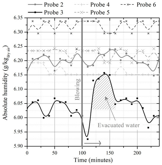 Figure 14 shows the changes in absolute humidity in the wet wall during operation of ventilation device on a much smaller time scale. The absolute humidity content in the wall (probes 4, 5 and 6) was relatively constant, which is a sign of hygroscopic equilibrium. The absolute humidity of the air blown into the air gap also showed very small variations, with a noticeable increase in absolute humidity a few minutes after switching on the aeraulic system, between the 100th and 150th min (probe 2). On the other hand, probe 3 shows a different behavior: before ventilation of the air gap, hygroscopic balance is visible with a relatively stable absolute humidity content, followed by a sudden increase in the absolute humidity content for about 40 min after t = 100 and then a return to equilibrium. An increase in absolute humidity is synonymous with an increase in the amount of water, in the form of vapor, in the ventilated air space. On contact with the wet wall, the air is charged with water molecules, which are then evacuated by the suction system at the top of the wall. This phenomenon shows the dynamics induced by the system that produces a water transfer towards the ventilated air gap. This is caused by the modification of the hygroscopic exchange coefficient at the interface between the wall and the air gap. The forced convection of air will increase this exchange coefficient and thus evacuate the water vapor present on the internal surface of the wall. The absolute humidity within the air gap increases at an average speed of around 4.86 g/kg.h, thus ensuring the absence of surface condensation. The low ventilation speeds used then govern this low rate of water vapor evacuation.