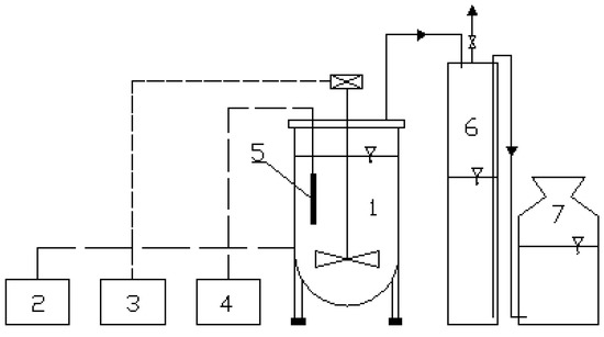 Diagram of the digester with instrumentation. (1) glass cylinder with an active volume of 5 dm3, (2) heat exchanger, (3) mixing system, (4) temperature and pH control system, (5) measuring probe, (6) biogas tank, and (7) equalization tank.