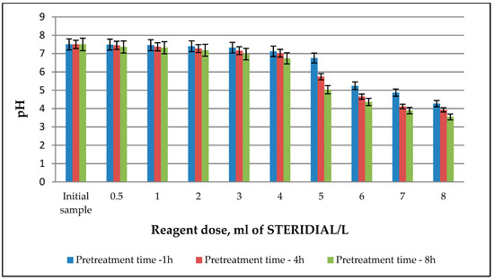 Due to the technological conditions of the anaerobic stabilization process, a reagent dose of 3.0 mL of STERIDIAL W-10/L of sludge was selected for further experiments, for which, along with the subsequent increase in sludge biodegradability, there was no need to modify the pH of the sludge treated. In the case of higher doses, a correction of the pH value would be necessary and would cause secondary contamination of the treated medium. The reagent dose of 3 mL of STERIDIAL W-10/L, and the pretreatment time of 1 h were found to be the most favorable pretreatment conditions. According to Domínguez Henao et al. [25,26,27], regarding the kinetics of the changes induced by peracetic acid, the value of the rate constant and the initial consumption of PAA increases with increasing content of organic matter. Therefore, the half-life of PAA dosed to sludge is short, with a large amount of suspended solids.
