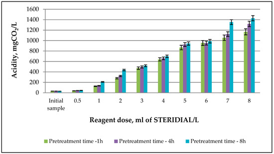 According to Procházka et al. [49], the insignificant impact of PAA on the excess sludge pH could be caused by buffering capacity, that is, equilibrium between ammonium, carbonate, and volatile fatty acids (e.g., acetic, propanoic, and butyric acids). An increasing trend was observed in the case of the total acidity of the sludge pretreated with the reagent in the range of doses of 0.5 ÷ 8 mL of STERIDIAL W-10/L, with values of 37 ÷ 1167 mg CO2/L for the pretreatment time of 1 h, 42 ÷ 1318 mg CO2/L for the pretreatment time of 4 h, and 45 ÷ 1427 CO2/L for the pretreatment time of 8 h (Figure 3).