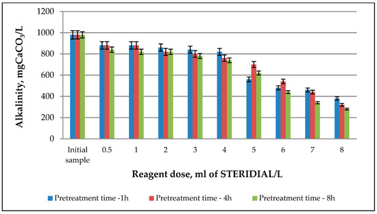 A decreasing trend was observed for total alkalinity determined in the case of pretreated sludge, with values ranging from 380 to 880 mg CaCO3/L for 1 h, 320 to 880 mg CaCO3/L for 4 h, and 280 to 840 mg CaCO3/L for 8 h (Figure 4).