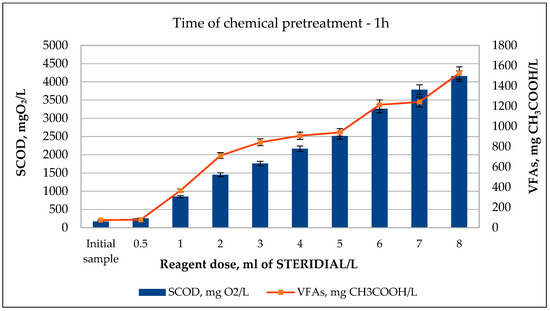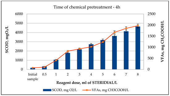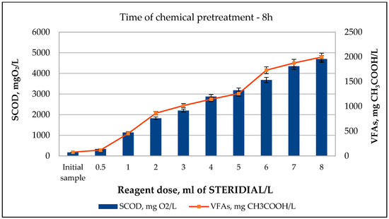 As a result of 1, 4, and 8 h of sludge disintegration by addition of STERIDIAL W-10 solution in doses ranging from 0.5 ÷ 8 mL/L, an increase in the soluble chemical oxygen demand (SCOD) values was from 256 to 4157 mg O2/L for the pretreatment time of 1 h, from 324 to 4638 mg O2/L for 4 h, and from 332 to 4698 mg O2/L for 8 h with respect to the lowest and the highest reagent doses, respectively (Figure 5, Figure 6 and Figure 7). Based on the results obtained, Cavallini et al. [50] concluded that PAA leads to an increase in the concentration of dissolved organic matter, resulting in an increase in chemical oxygen demand in sewage by approximately 20 mg/L for every 10 mg/L of PAA used. As the reagent dose increased, a gradual increase in the concentration of volatile fatty acids determined in the supernatant liquid of the pretreated sludge was noted. For the tested reagent doses of 0.5 ÷ 8 mL STERIDIAL W-10/L, a 1.1-fold to 20.4-fold increase in the VFA concentration for the pretreatment time of 1 h, 1.4-fold to 26.3-fold for 4 h, and 1.6-fold to 26.6-fold for 8 h, were obtained with respect to the VFA concentration values of the non-pretreated sludge (Figure 5, Figure 6 and Figure 7). According to data in the literature [28,30,31], chemical disintegration with peracetic acid promotes the formation of highly reactive hydroxyl radicals, which is an important oxidizing agent during chemical pretreatment.