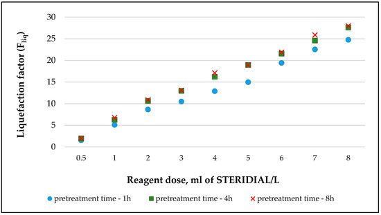As a result of the disintegration of sludge by adding STERIDIAL W-10 solution in doses ranging from 0.5 to 8 mL/L, the values of the liquefaction factor were 1.5 to 24.7 for the pretreatment time of 1 h, 1.9 to 27.6 for the pretreatment time of 4 h, and 2.0 to 28.0 for the pretreatment time of 8 h. It was observed that for the reagent doses tested, similar values of the sludge liquefaction factor were obtained for greater treatment times (Figure 8).