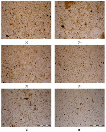Structure of non-pretreated excess sludge (a) and structure of excess sludge chemically disintegrated with the reagent with the selected doses: 0.5 mL STERIDIAL W-10/L (b), 1.0 mL STERIDIAL W-10/L (c), 2 mL STERIDIAL W-10/L (d), 3 mL STERIDIAL W-10/L (e), and 8 mL STERIDIAL W-10/L (f) sludge for 1 h.