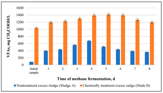 With the changes taking place in the physicochemical and structural properties of the disintegrated sludge, an increase in the amount and rate of production of volatile fatty acids (VFAs) was observed at the stage of sludge acid digestion compared to the anaerobic stabilization of pretreated sludge. The combination of acid hydrolysis caused by the introduction of peracetic acid (PAA) and biological hydrolysis, which is the first phase of methane fermentation, resulted in an increase in the efficiency of anaerobic stabilization compared to the efficiency of stabilization of the non-pretreated sludge. According to data in the literature [19], hydrolysis in conventional systems of sludge treatment based on anaerobic processes has a decisive effect on the rate of methane fermentation, and it takes place with the participation of exoenzymes produced by microorganisms.