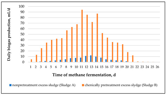 During methane fermentation of sludge subjected to chemical disintegration with a reactant dose of 3.0 mL of STERIDIAL W-10/L (sludge B), the highest value of daily biogas production (0.28 L) was observed on the 10th day of the process. Total biogas production of 3.53 L was recorded, which translated into a specific biogas production of 0.52 L/g VSS. In the case of the conventional sludge methane fermentation (sludge A), the highest value of daily biogas production (0.12 L) was observed on day 12. A total biogas production of 0.97 L was recorded, which translated into specific biogas production of 0.2 L/g VSS. According to the literature data [45], biogas production efficiency can be determined with reference to the volume of the digester expressed in m3, the volume of biogas per one inhabitant, or by defining the volume of biogas obtained from the removal of a load of pollutants contained in the sludge expressed as dry organic matter, i.e., biogas yield (L/g VSS).