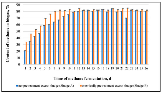Figure 11 shows the course of biogas generation, while Figure 12 shows the proportion of methane in biogas expressed in volume percentage during conventional methane fermentation of sludge and methane fermentation of chemically disintegrated sludge.