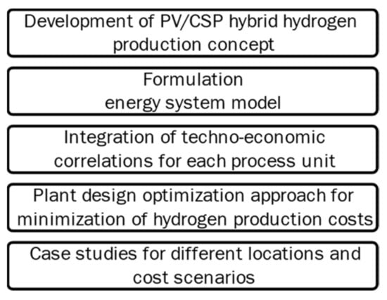 The focus of this work is the development of a techno-economic system model which permits to design PV/CSP powered hydrogen production plants by minimizing the hydrogen production costs. Figure 1 presents the main stages of presented work.