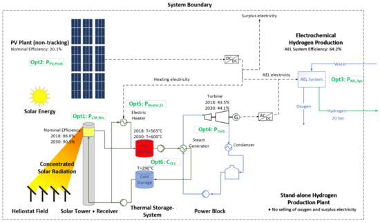 In this study, the AEL system is operated in standby mode when less than the minimum AEL power input is available, consuming then 1% if it is nominal power without producing hydrogen. The model is designed in a way that this standby-mode electricity demand can always be covered. In case that not enough electricity for standby mode operation is available, the difference is covered by additional electricity which represents an additional source, e.g., a battery system. The electricity cost for was defined with the interactive online tool of a cost outlook study for electricity storage systems [23,24]. With this tool a levelized cost of storage (LCOS) of 150 USD/MWhel was determined assuming a battery storage with 365 annual cycles and a discharge duration of 12 h. The cost of charging was set to zero, assuming that surplus electricity during daytime can be used for charging. is introduced here to simplify the system for the overall design optimization without considering an operational strategy of the TES. In a more detailed analysis of a predesigned PV/CSP hybrid hydrogen production plant, an operational strategy of a combination of TES and a battery storage could be also considered, but this is beyond the scope of this work. Different hydrogen production concepts were analyzed by varying the optimization variables constraints.
