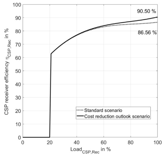 Modelled CSP receiver efficiency depending on the load of the receiver. Values for standard and cost outlook scenario.