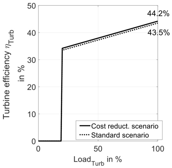 The minimum load is 20% of the nominal turbine power. Similar to greenius above the minimum load a linear increase of the efficiency to the maximum value was implemented [22]. Figure 4 illustrates the used correlation for the standard and the cost outlook scenario, in which the maximum efficiency increases from 43.5 to 44.2% (compare Section 2.1).