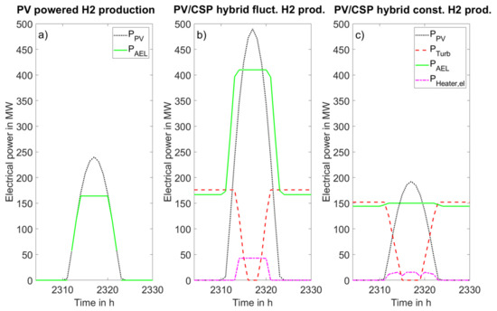 Comparison of different solar hydrogen plant operational concepts for a day with good solar irradiation. Results from the standard cost scenario for the location Ouarzazate, Morocco. (a) PV powered H2 production; (b) PV/CSP powered fluctuating H2 production; (c) PV/CSP powered constant H2 production.